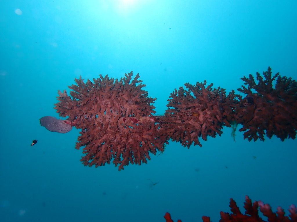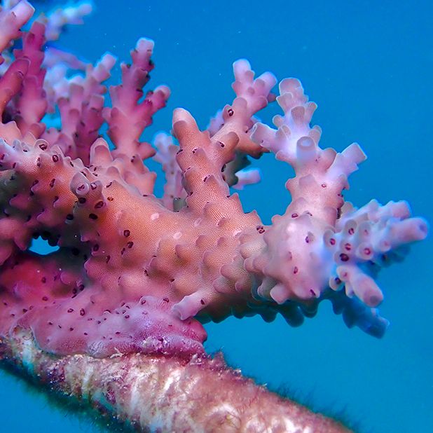 Each fibreglass branch on the midwater coral nursery is populated with large fragments cut from a mature colony on the reef in accordance with our permit. We cut fragments of each species from 10 separate mature colonies in disparate collection zones to ensure genetic diversity within species in our nurseries. We secure the fragments directly to the branches in genotype clusters. The fragments grow towards each other and fuse to form a single colony that will grow to reproductive maturity and spawn year after year. There are 40 branches on a coral nursery, and we are permitted to work with all species of hard and soft corals. It’s a meticulous task to fully populate a nursery, but it’s done once then left to add millions of fertilised larvae to the environment once it has attained sexual maturity.